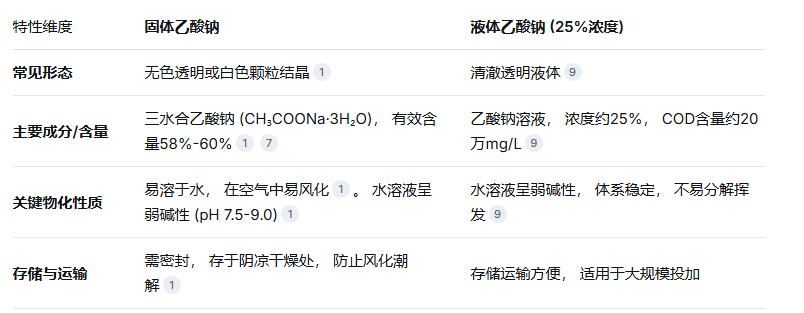 污水处理中常用的乙酸钠主要有固体和液体两种形态,其主要特性对比如下: