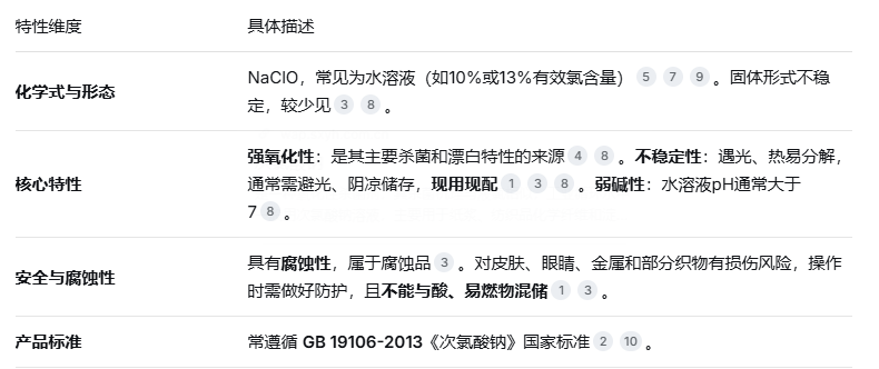次氯酸钠产品通常为微黄色溶液,有类似氯气的刺激性气味。下表汇总了其关键特性: