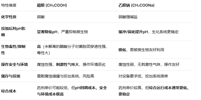 原理:醋酸进入水体后,会部分解离成乙酸根离子(CH₃COO⁻)和氢离子(H⁺)。微生物利用的是乙酸根,但同时会引入大量H⁺导致pH急剧下降,严重抑制生化系统。