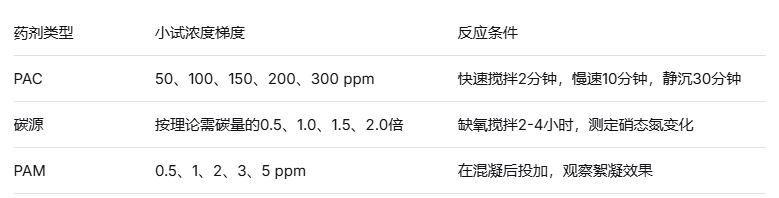 2.烧杯小试:模拟实际工艺(如混凝沉降、反硝化反应),对比不同药剂、不同投加量的处理效果。