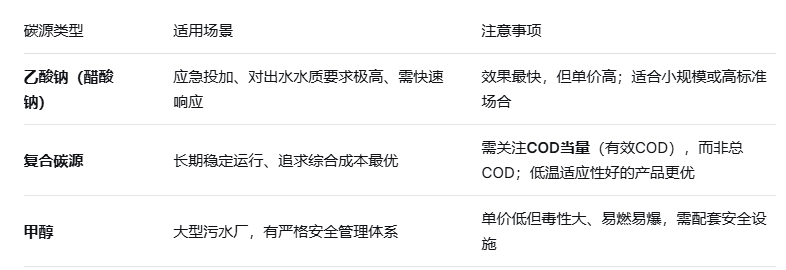 碳源的选择直接关系到脱氮效率和运行成本。